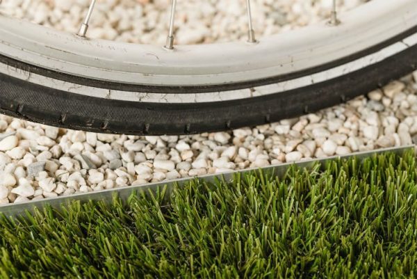 - Platzieren Sie die L-Profile auf dem verdichteten und geebneten Sandbett. Durch das Durchtrennen einiger „Brücken“ und deren Aufbiegen kann das Unkrautvlies der Gravel Fix Platte darüber gedrückt werden. Nachdem die Kiesplatte nach unten gedrückt wurde, biegen Sie die Brücken wieder zurück, sodass die Platte am Profil fixiert ist. Bei starker seitlicher Belastung universelle Erdnägel oder andere geeignete Methoden verwenden.